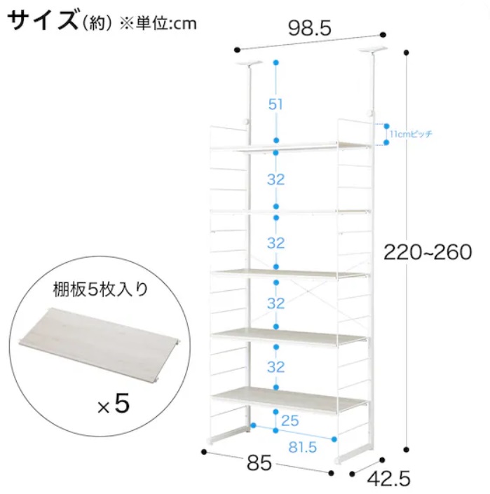 25~153cmの間で11cm間隔で棚板の高さを調整できる。(棚は全部で5枚)